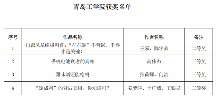 学校坚持“以赛促学、以赛促创”育人理念。近三年,学校学子在科普类竞赛中屡创佳绩,获得省部级二等奖1项、三等奖11项,市厅级二等奖1项、三等奖3项。这些成果不仅获得上级主管部门的充分肯定,更成为学校培育学生科普创作能力、提升学生科学传播素养的有力佐证。下一步,青岛工学院将持续深化科普教育与科技创新融合,引导更多青年学子投身科学传播事业,为推动青岛地区科普信息化建设、培育创新型人才贡献“青工力量”。